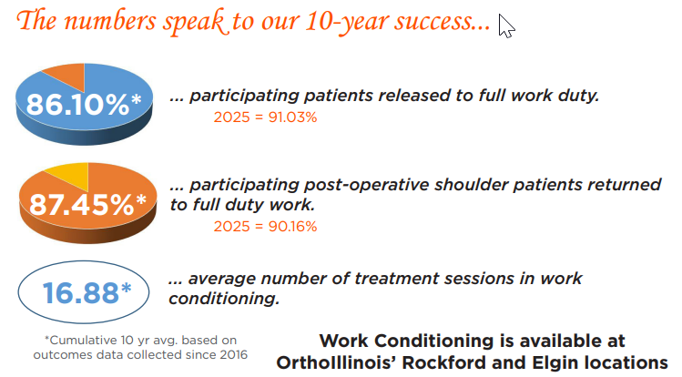 FCEs assist the physician in determining a worker’s ability to return safely to his/her job. If the results of the FCE reveal the worker is unable to meet the job’s demand, it will assist the clinician in making further recommendations for treatment (which may include Work Conditioning) or a return to work with restrictions and/or reasonable accommodations. OrthoIllinois’ WorkRight℠ providers utilize the XRTS FCE testing system, offering the most objective way to measure effort – of critical importance as recent studies have shown that the biggest predictor of the functional outcome of a FCE is the validity of the effort that the worker puts forth during testing.